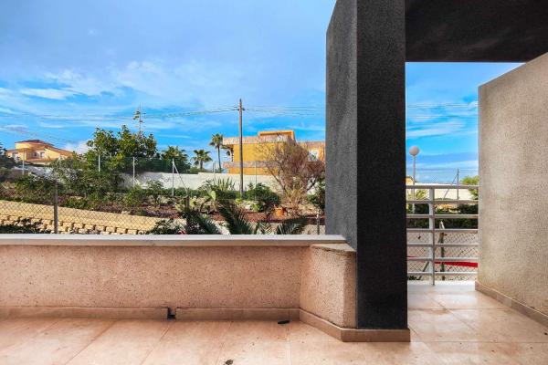Venku má příjemnou terasu o rozloze přibližně 10 m² s výhledem na zelené plochy obytné čtvrti, ideální pro odpočinek, snídani venku nebo celoroční užívání středomořského klimatu.
