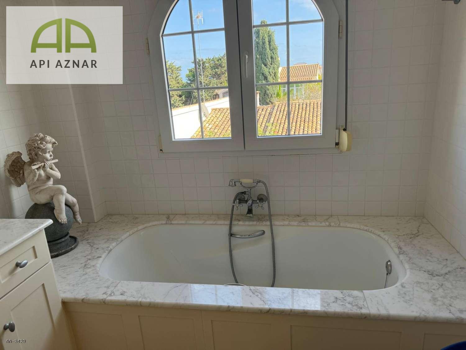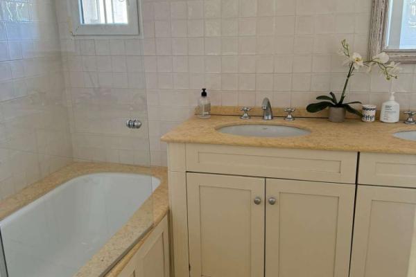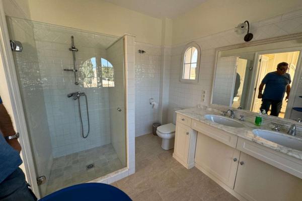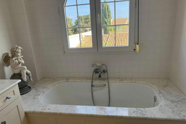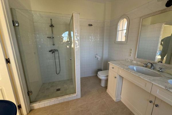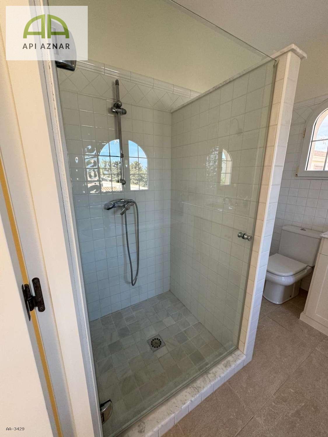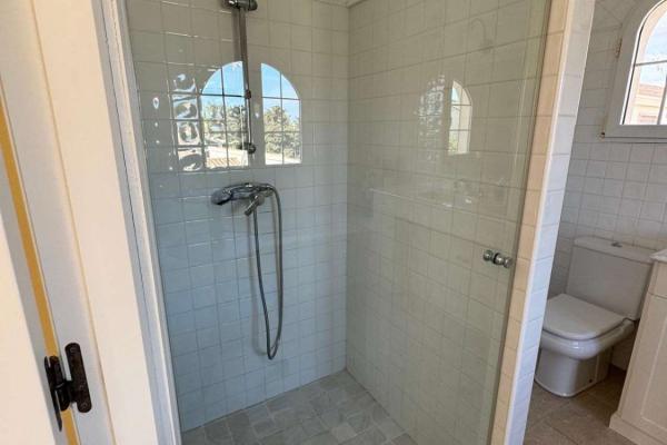 Øverste etage rummer et soveværelse med stort badeværelse med eget badeværelse, udstyret med bruser og badekar, samt adgang til en privat terrasse.
