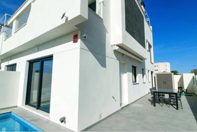 South Facing Corner House 500 m from the Beach in Santiago de la Ribera This charming, south-facing corner house is located just 500 metres from the beach in Santiago de la Ribera. With a privileged location, in front of a quiet park, it offers the perfect combination of tranquility, sun and proximity to the sea and its promenade. The property has 3 bedrooms, 3 bathrooms, a heated pool and a spacious roof terrace. With all the comforts and extras included, this property is ready for you to settle in and enjoy from day one. Interior Features: Total area: 56 m² built and 90 m² habitable. Kitchen: Modern, open and fully equipped overlooking the pool. Bedrooms: 3 large bedrooms with fitted wardrobes (1 on the ground floor and 2 on the upper floor). The master bedroom has access to a large private terrace. Bathrooms: 3 full bathrooms, one of them on the ground floor. Comfort: Automatic roller blinds, air conditioning and heating in all rooms. Storage: Spacious cupboard/storage room under the stairs. Extras: Furniture included, both indoor and outdoor, as well as mosquito nets on various windows. Exterior Features: Land: 128 m² plot, fully fenced for privacy. Heated pool: 4.5 x 3 meters, ideal to enjoy all year round. Terraces and solarium: Large terrace on the first floor and solarium with outdoor kitchen. Awnings: Installed both on the terrace and on the roof, perfect for creating shaded areas. Setting: Located just 500 meters from the beach, the house offers an ideal place to enjoy the warm Mediterranean climate. The palm-lined promenade is perfect for walking, both day and night, with a varied offer of restaurants, tapas bars and the ever-popular marina.