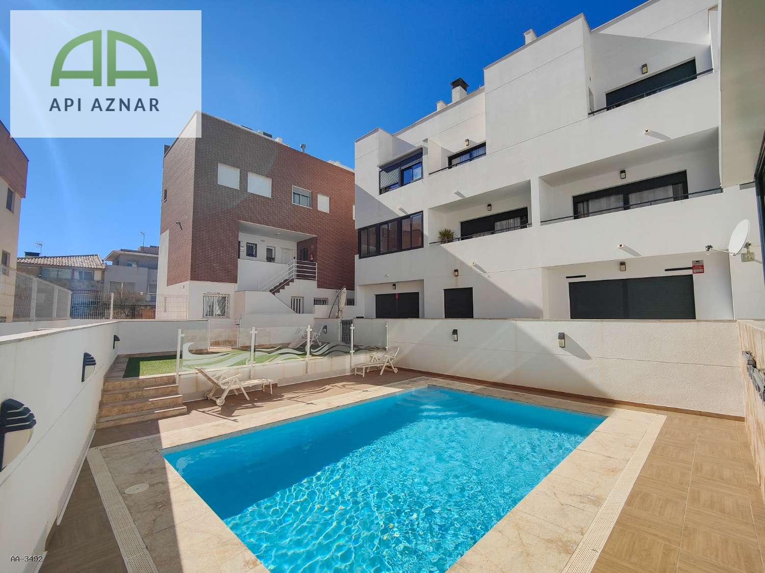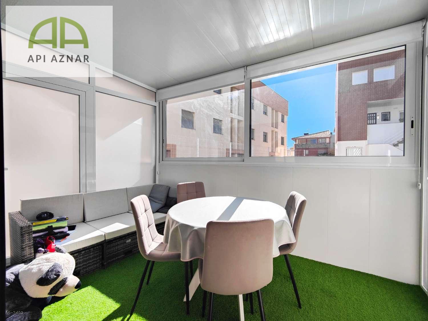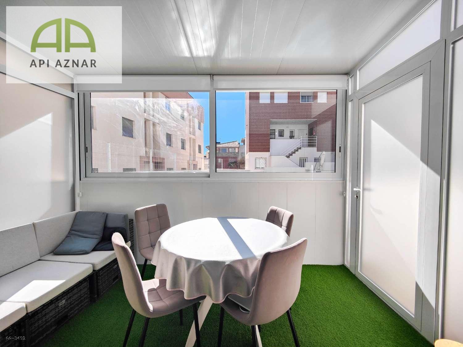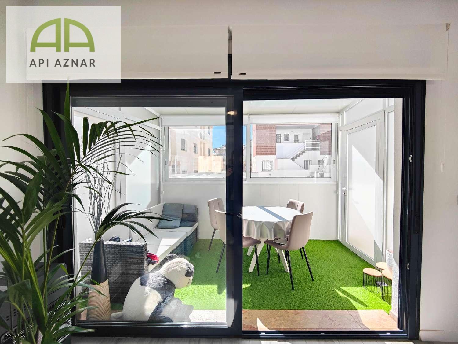 Uno de sus grandes atractivos es la terraza acristalada de aproximadamente 8 m², orientada al sur y equipada con césped artificial, desde la que se disfruta de agradables vistas a la piscina comunitaria. Desde aquí se accede directamente al garaje privado y cerrado, situado justo debajo de la vivienda, proporcionando máxima comodidad y seguridad.