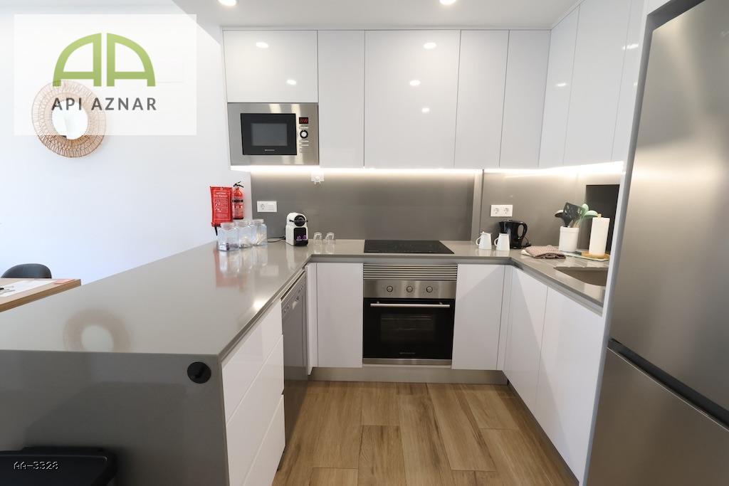 Cocina abierta moderna, totalmente equipada, con lavavajillas y lavadora ubicada en el cuarto de lavado del balcón.