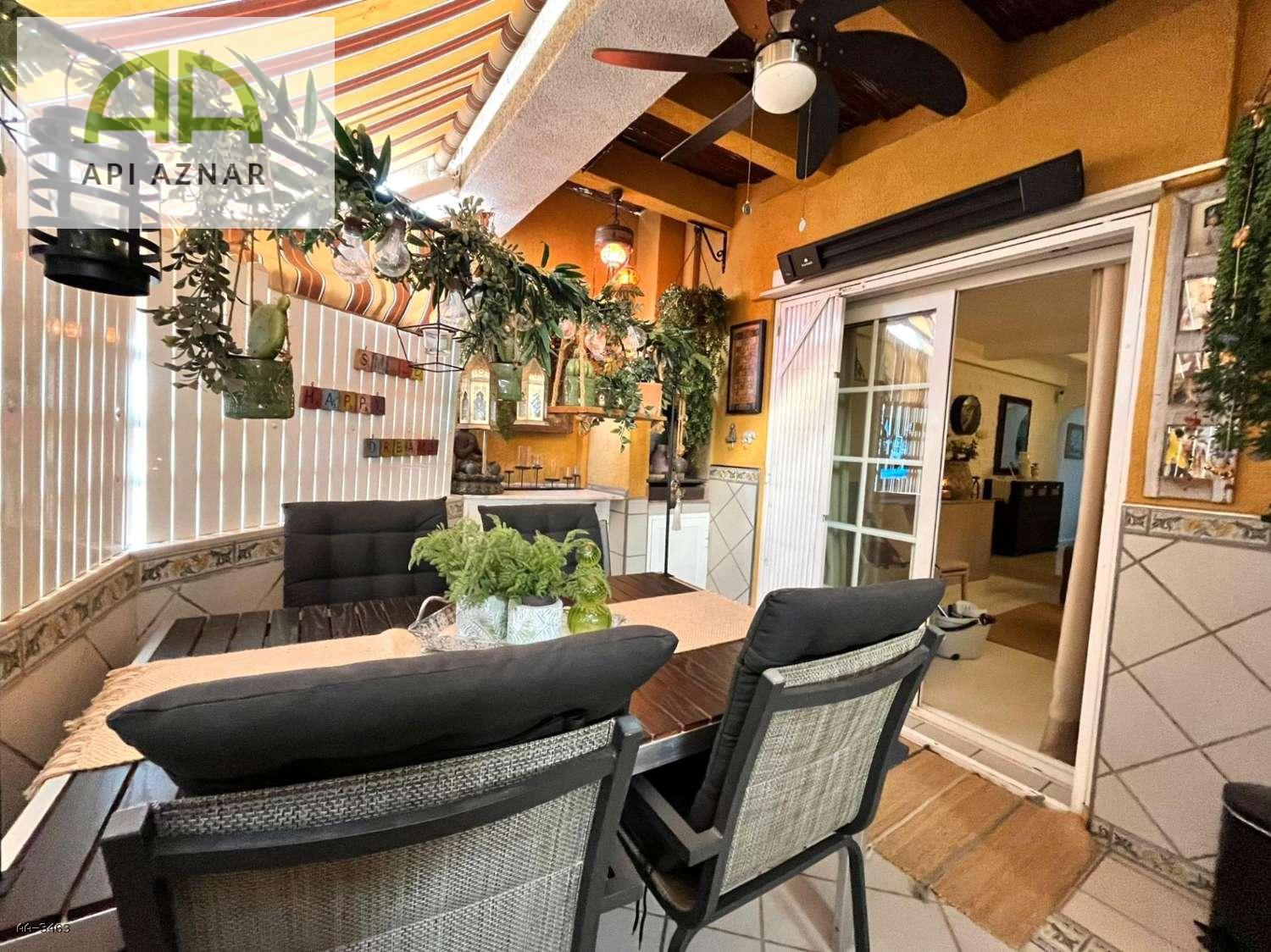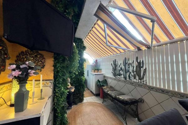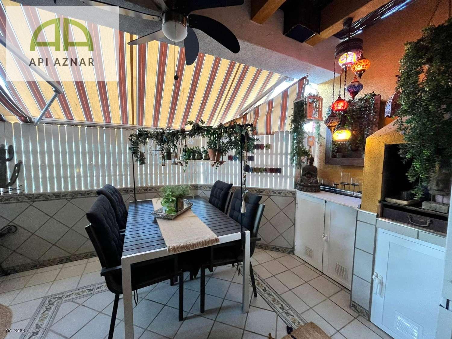Amplia terraza con barbacoa, parcialmente cubierta con toldos, perfecta para disfrutar del sol y cenas al aire libre.