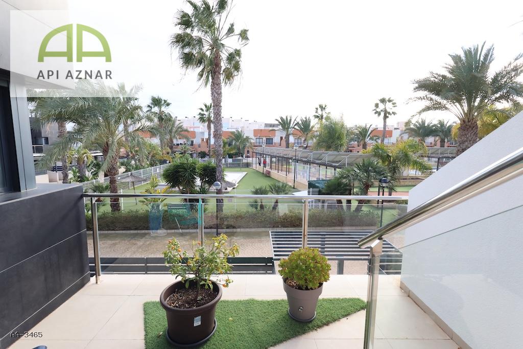 En la parte delantera encontramos un amplio jardín privado con vistas directas a la zona comunitaria. En la planta superior, la vivienda ofrece un gran solárium con agradables vistas a las zonas comunes, las dos piscinas comunitarias y la zona de juegos infantiles.