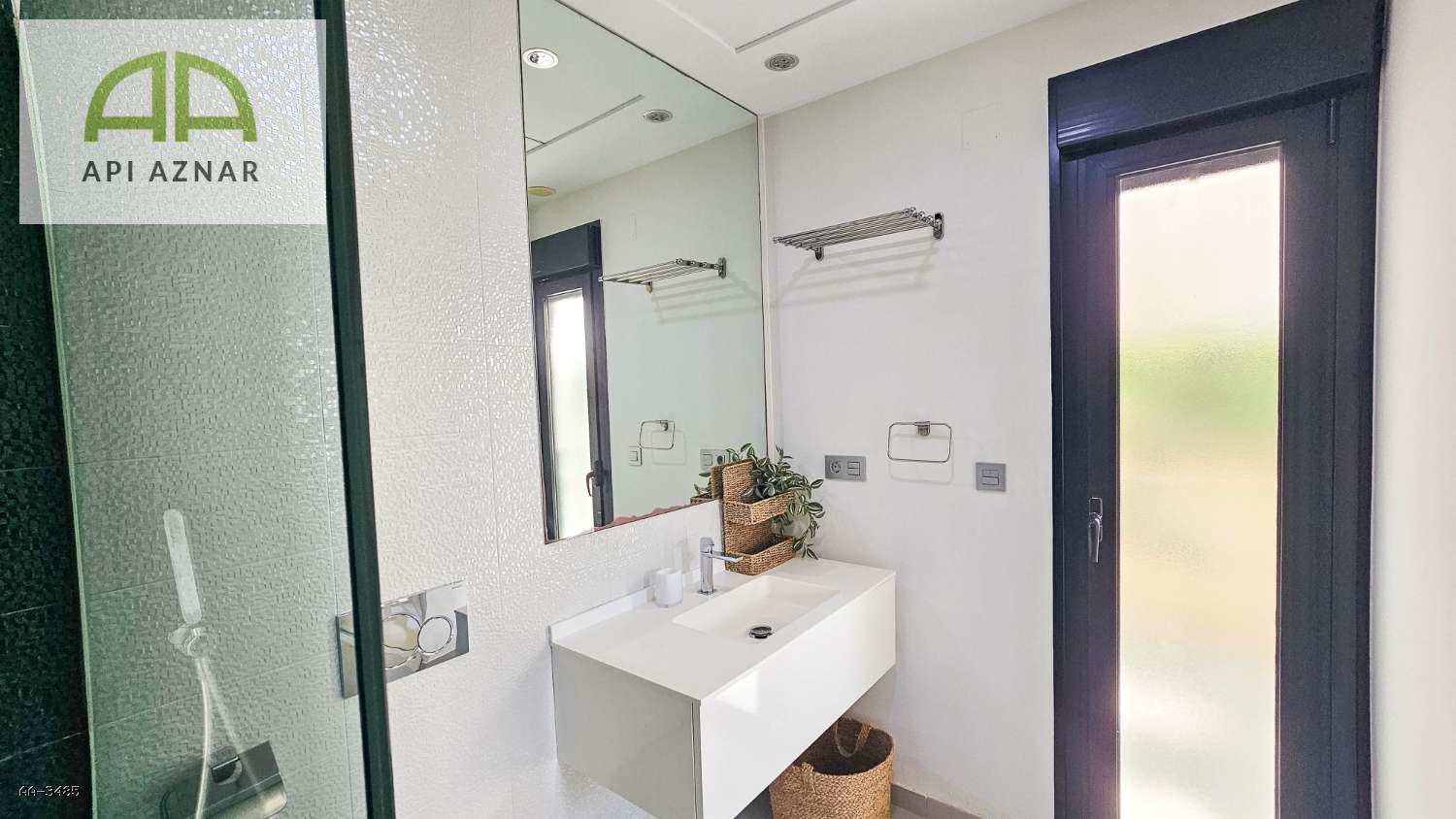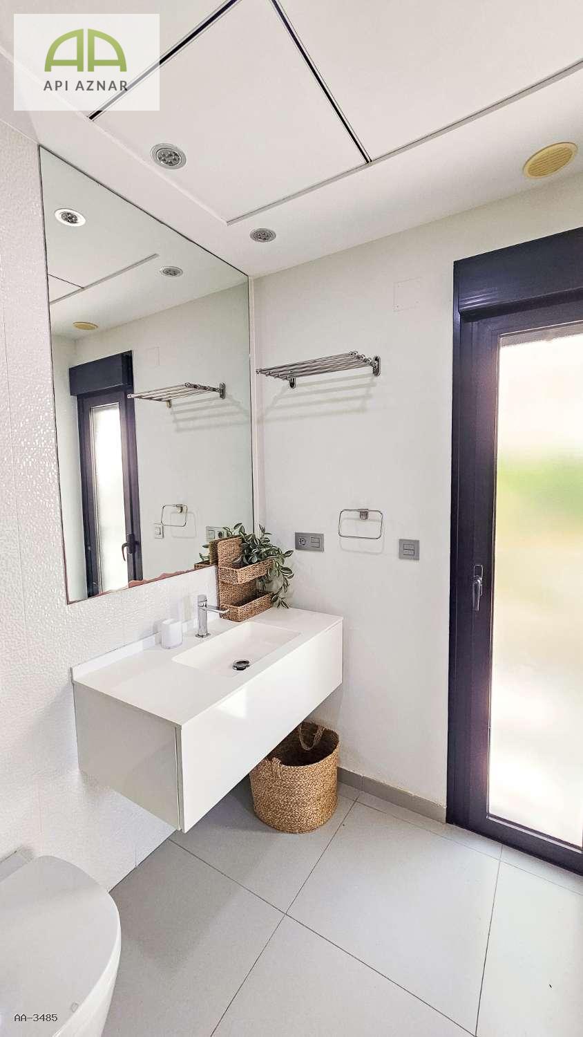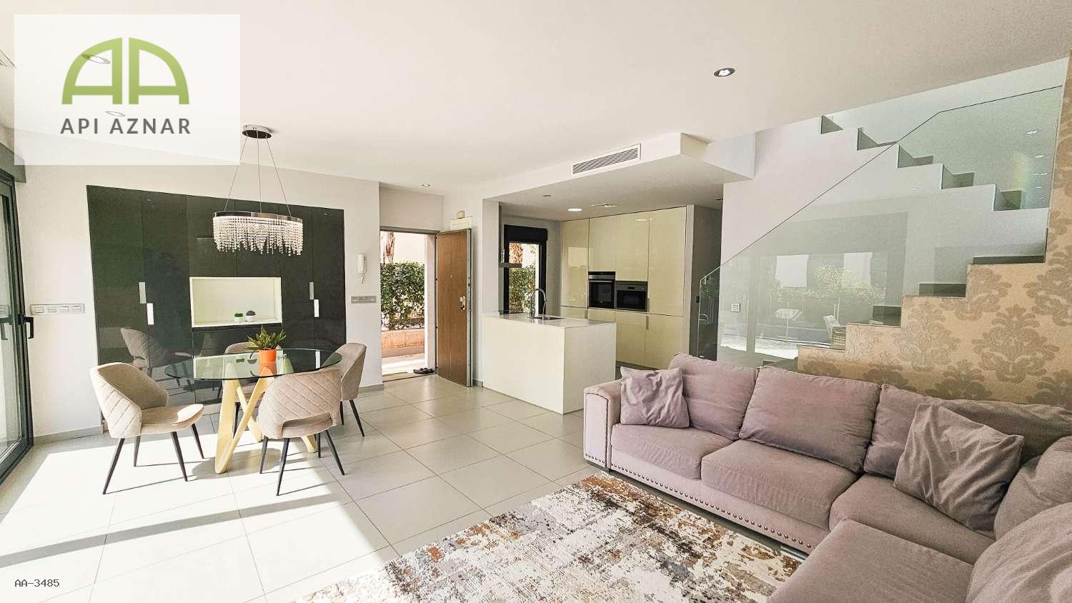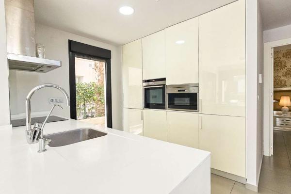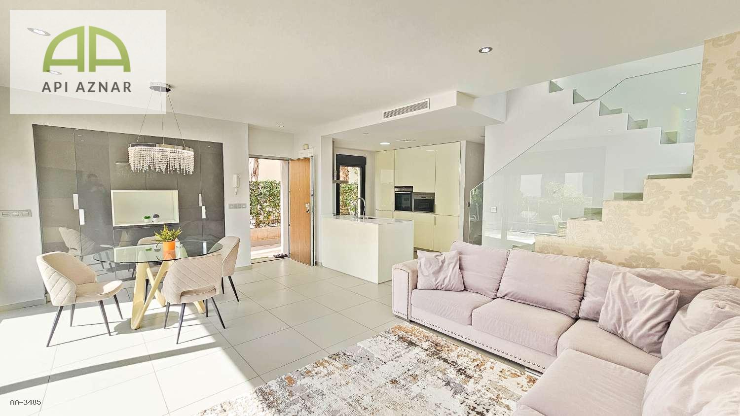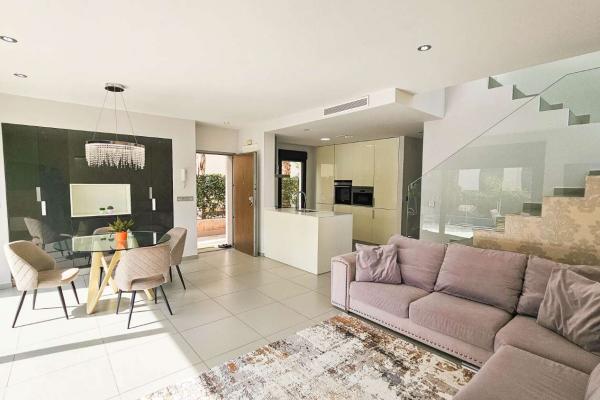 Distribuida en dos plantas, cuenta con un amplio salón-comedor con cocina abierta totalmente equipada, 3 dormitorios (uno en planta baja con vestidor), 2 baños completos y 1 aseo. En la planta superior, los dormitorios tienen acceso a terraza privada y conexión a un gran solárium ideal para disfrutar del sol todo el año.