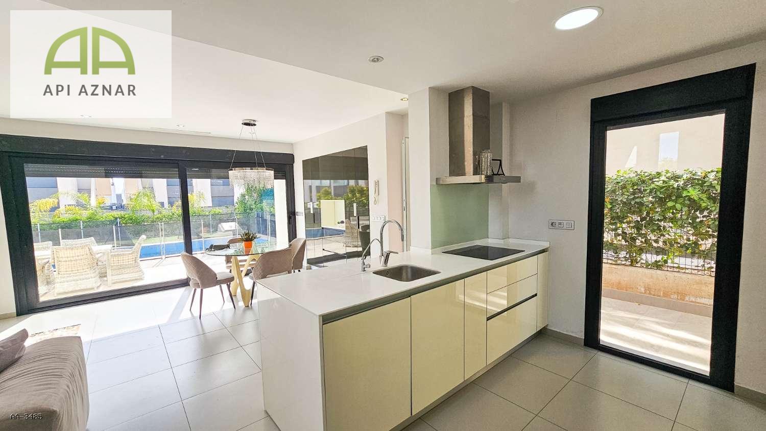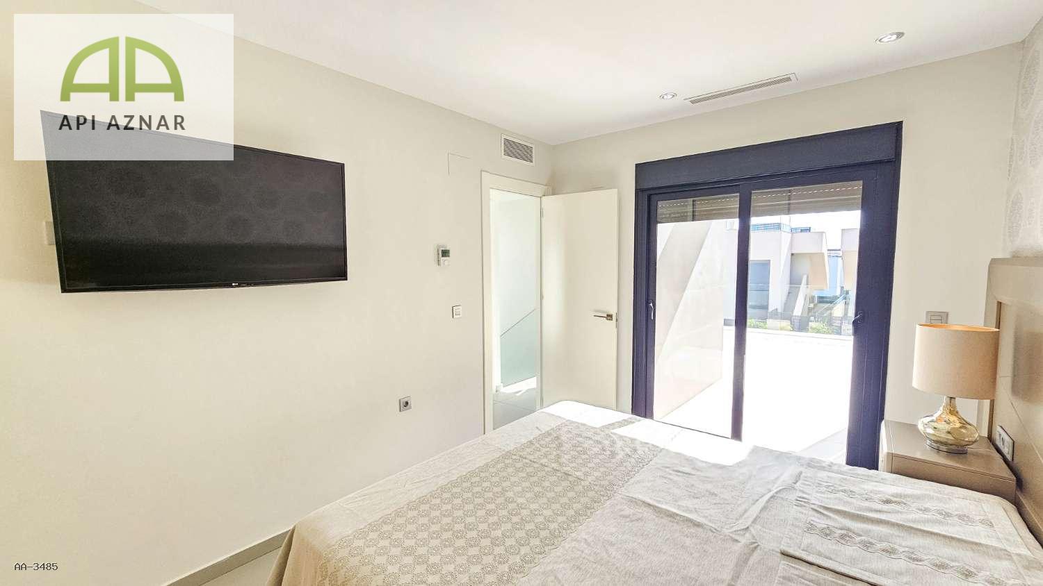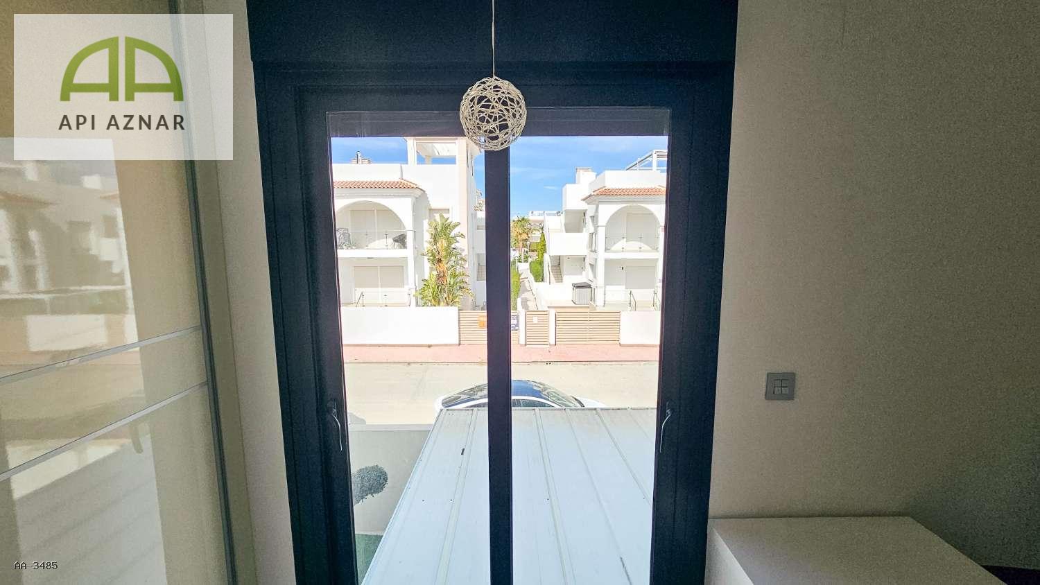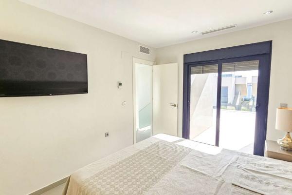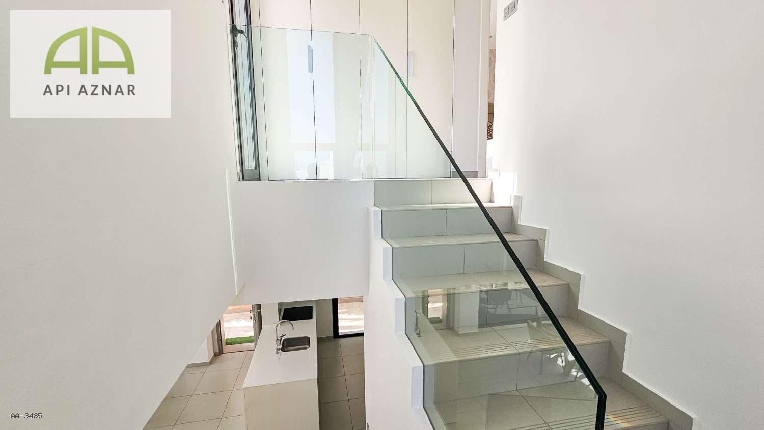 Distribuida en dos plantas, cuenta con un amplio salón-comedor con cocina abierta totalmente equipada, 3 dormitorios (uno en planta baja con vestidor), 2 baños completos y 1 aseo. En la planta superior, los dormitorios tienen acceso a terraza privada y conexión a un gran solárium ideal para disfrutar del sol todo el año.