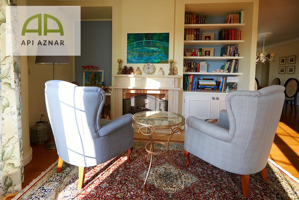 Tilava ja valoisa olohuone, jossa on rentoutumisalue ja takka
