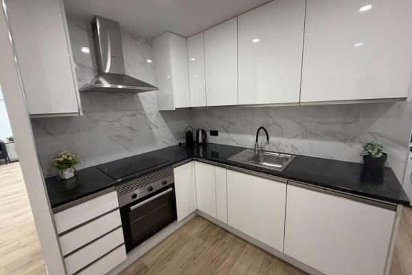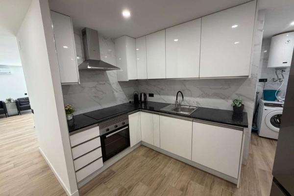 Нова та обладнана кухня з духовкою, мікрохвильовкою, посудомийною плитою, електричною плитою та великим холодильником з морозильною камерою